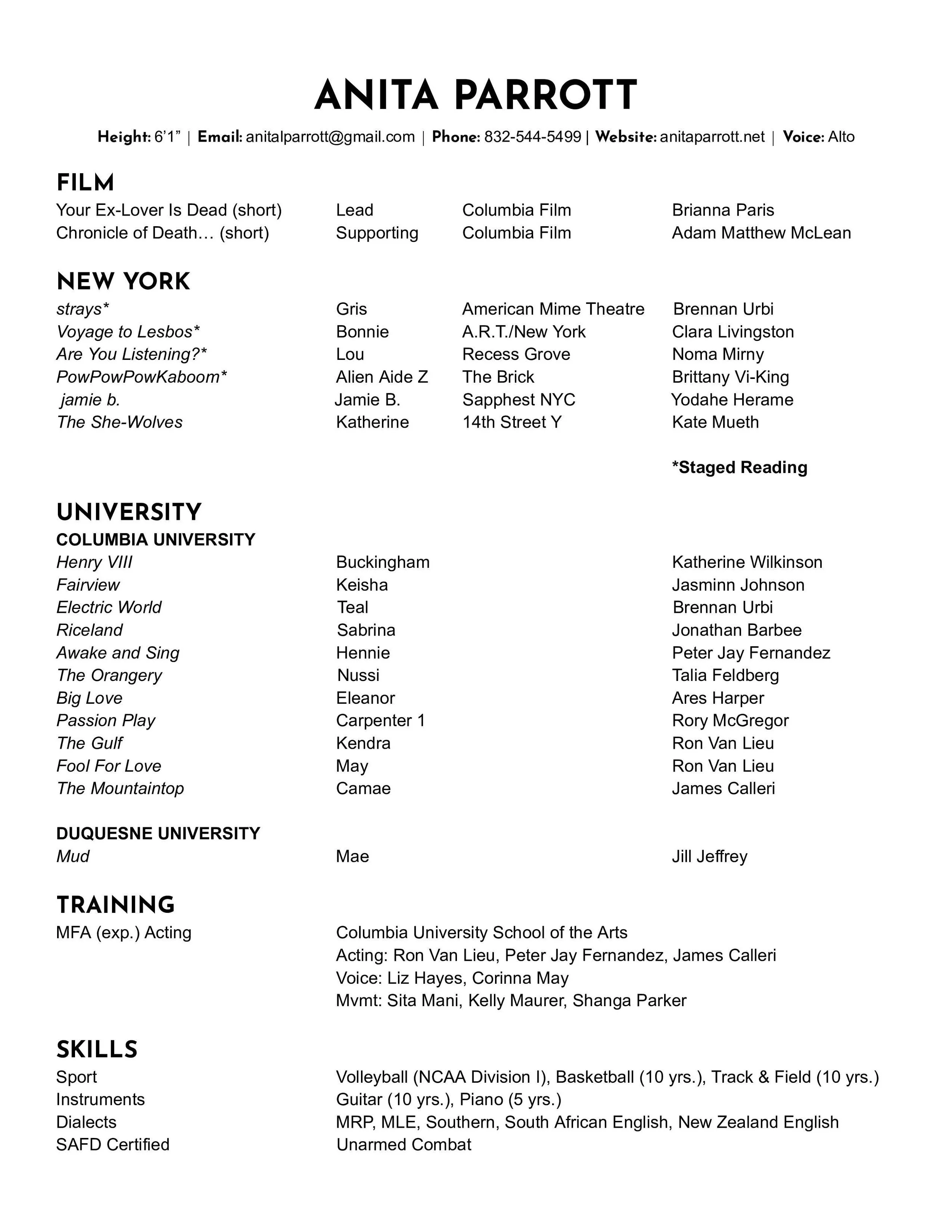 Recent acting credits: Strays (American Mime Theatre); Henry VIII, Fairview, Riceland, The Orangery, Big Love, and Passion Play (Columbia SOA); Are You Listening? (Recess Grove); The She-Wolves (14th Street Y); and jamie b. (Caveat).